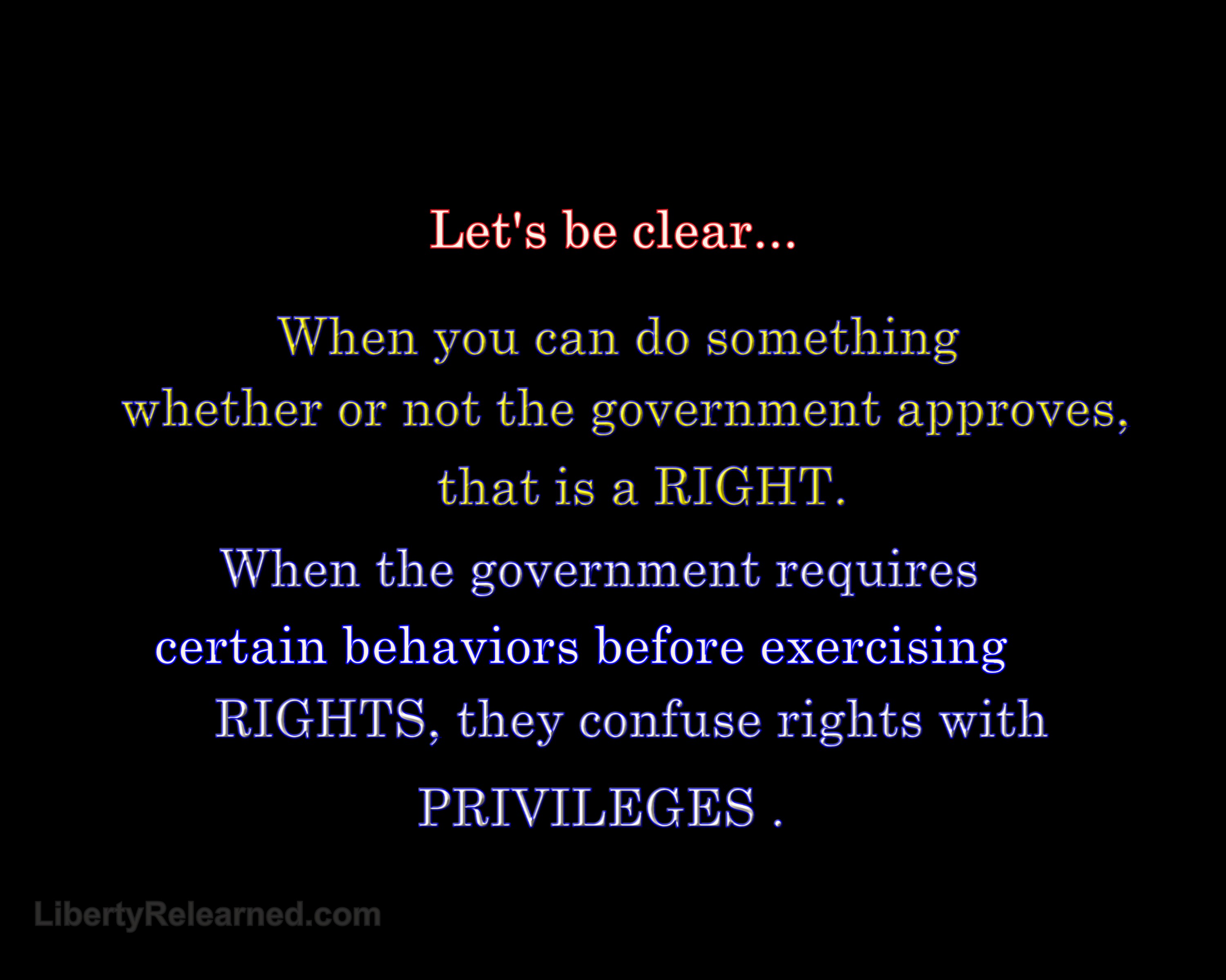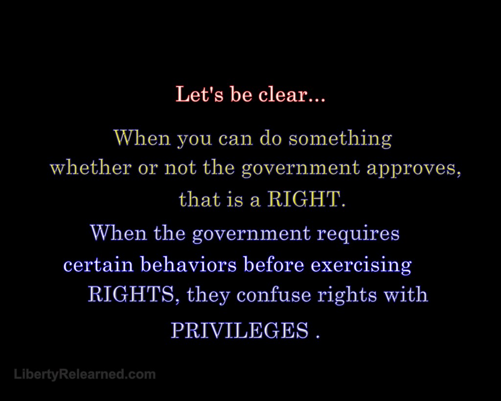 Rights vs. Privileges March 14, 2021 JP Mac PoliticsHuman Rights, Privileges, Rights Because some of our leaders are confused. True rights do not require government approval to exercise. For instance we have freedom of association, that is a right. When the government tries to place requirements on our right to freedom of assembly, it treats that right as a privilege. Share this: Click to share on X (Opens in new window) X Click to share on Facebook (Opens in new window) Facebook Like Loading...