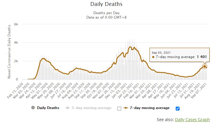 This graph shows daily deaths. I think daily deaths show a more accurate picture, as cases more variables go into the number of cases such as amount and kind of testing. These numbers also show that this current COVID spike may have peaked. If this cycle holds, the US can expect another spike to stat sometime in November. I will be interested to see if the raise to the levels of last year of level off due to vaccinations, suggesting heard immunity is setting in. If we see a divergence between cases (going up) and deaths (going down) than that could mean vaccination is doing good at preventing death, but not cases. It could also mean that the dominant variant is weaker, less deadly. This would follow a common pattern of attenuation that viruses go thorough.