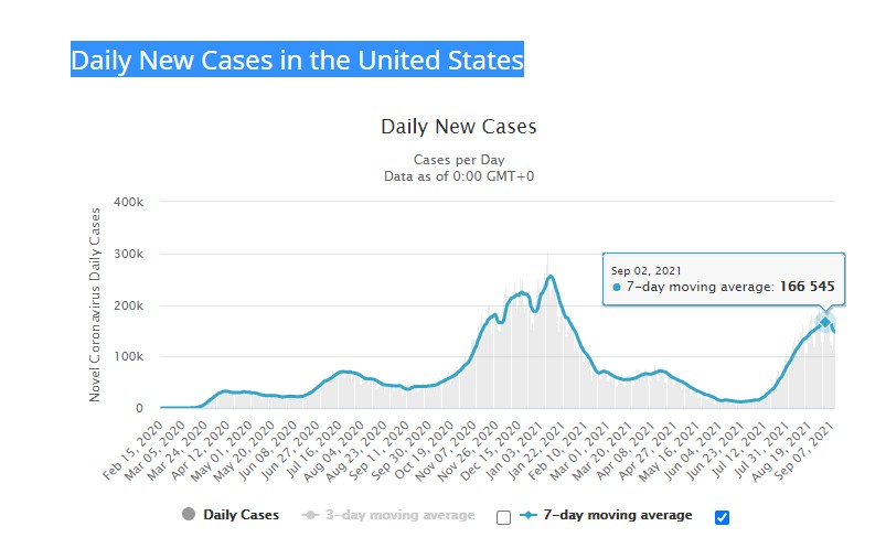 This graph shows that (hopefully) Covid cases in the US have already peaked. This may be important because I noticed mask mandates seem to come after peaks, not before them. President Biden has just made his vaccine mandate speech, so I wanted to be armed with facts should he try to take credit for what should be the coming dip in cases.