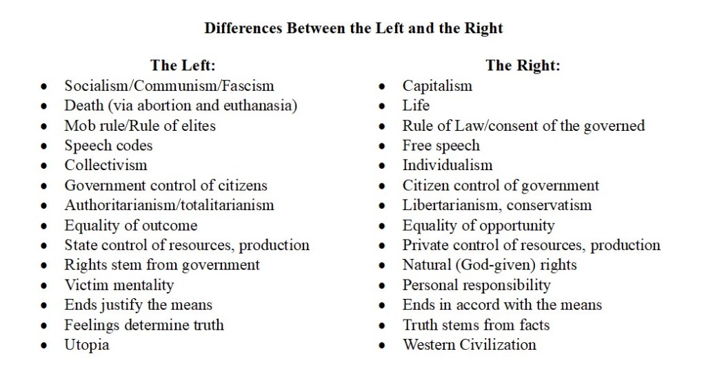What determines what is “left” and what is “right” politically and socially? What are some of the core values of each ideology and how are they manifested in today’s society? Essentially, it comes down to collective vs. individual ethics. The left believes in collectivism and the right, individualism. Communism, socialism, and fascism are all examples of collectivist socio-economic societies. The right seeks to conserve Western Civilization, the Left seeks to tear it down and replace it with a collectivist Utopia. The problem with Utopias is they cannot exist without a high degree of authoritarianism.